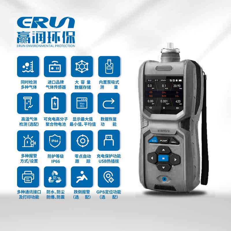 贏潤環(huán)保研發(fā)、生產(chǎn)的手持式泵吸型六合一多參數(shù)氣體報警儀ERUN-PG71S6可同時檢測氧氣、甲烷、硫化氫、一氧化碳、二氧化碳、氮氧化物或其他可燃有毒氣體,也可以配備溫度、濕度測量,檢測氣體種類超過500余種。